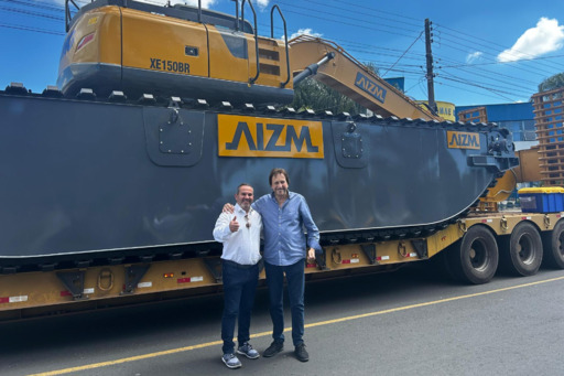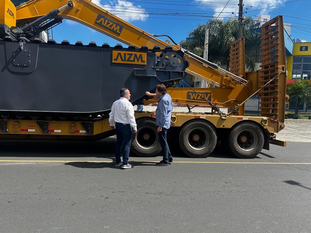 A máquina, fabricada pela marca AIZM, possui peso operacional de 23 toneladas e cerca de 5 metros de altura. Diferente das escavadeiras convencionais, o modelo é projetado para atuar em ambientes alagados, rios, lagoas e banhados. Graças aos flutuadores laterais e à estrutura adaptada, pode operar em solos extremamente encharcados sem afundar, além de realizar serviços como retirada de sedimentos, desassoreamento de rios, manutenção de canais de drenagem e controle de enchentes.